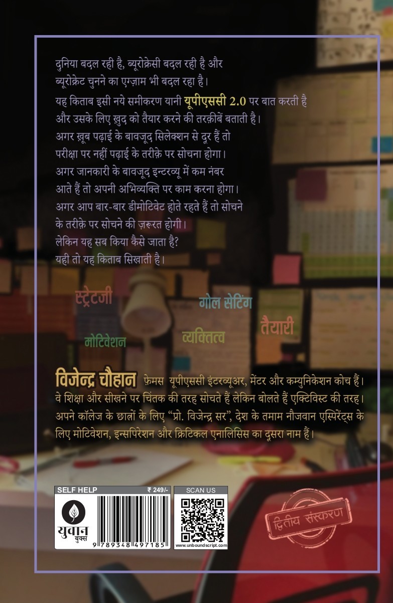 दुनिया बदल रही है, ब्यूरोक्रेसी बदल रही है और ब्यूरोक्रेट चुनने का एग्ज़ाम भी बदल रहा है । यह किताब इसी नये समीकरण यानी यूपीएससी 2.0 पर बात करती है और उसके लिए खुद को तैयार करने की तरकीबें बताती है। यह किताब मोटिवेशन की पारंपरिक किताबों से अलग अपने आसपास की वास्तविक दुनिया और खुद को समझने की नज़र देने वाली किताब है। इसका संदर्भ बेशक यूपीएससी है लेकिन असल में यह पढ़ने के तरीके और व्यक्तित्व तराशने का हुनर देने वाली किताब भी है। सो अगर खूब पढ़ाई के बावजूद सिलेक्शन से दूर हैं तो परीक्षा पर नहीं अपनी पढ़ाई के तरीके पर सोचना होगा । अगर जानकारी के बावजूद इन्टरव्यू में कम नंबर आते हैं तो आपको अपनी अभिव्यक्ति पर काम करना होगा । अगर आप बार-बार डीमोटिवेट होते रहते हैं तो अपने सोचने के तरीके पर सोचने की ज़रूरत होगी । लेकिन यह सब किया कैसे जाता है? यही तो यह किताब सिखाती है।