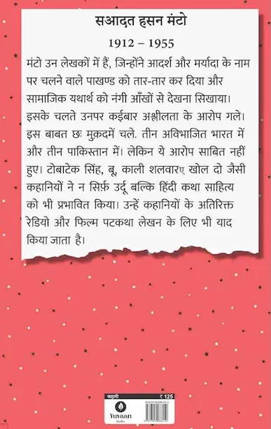 सआदत हसन मंटो (1912-1955) उर्दू के महानतम लेखकों में से एक थे, जिन्हें उनकी बेबाक और यथार्थवादी लेखन शैली के लिए जाना जाता है। उनका जन्म 11 मई 1912 को समराला, पंजाब (अब भारत) में हुआ था। मंटो ने अपने लेखन में समाज की कड़वी सच्चाइयों, विशेष रूप से विभाजन, गरीबी, वेश्यावृत्ति और इंसानी मनोविज्ञान को बारीकी से उकेरा।